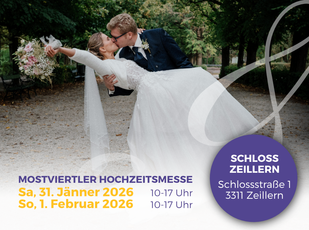 Im Januar 2026 ist es wieder soweit. Auf der Mostviertler Hochzeitsmesse können sich Brautpaare viele Inspirationen für eine Traumhochzeit holen. Am 31. Januar und 1. Februar 2026 treffen Sie auf viele Hochzeitsdienstleister im Schloss Zeillern. Schloss Zeillern wurde umfassend neu renoviert und uns stehen die neuen Räumlichkeiten mit dem Konzertsaal zur Verfügung. Das ist Ihre Gelegenheit alle persönlich kennenzulernen, Angebote einzuholen und sich von neuen Ideen inspirieren zu lassen. Am Samstag und Sonntag warten wir täglich von 10:00 -17:00 Uhr auf Ihren Besuch. Nehmen Sie Ihre Familie, Freunde und Trauzeugen mit, um die Planung Ihrer magischen Traumhochzeit zu beginnen. Eintrittspreis p.P. € 7,00. Karten können vor Ort erworben werden.